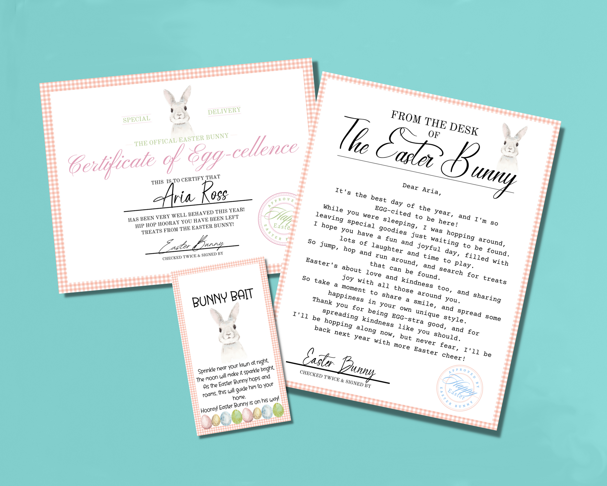 It includes a Pink Easter Bunny Bait Tag, an Easter Bunny Letter, and an Easter Bunny Certificate. These items feature cute Easter designs and are sure to make your Easter celebrations even more special.