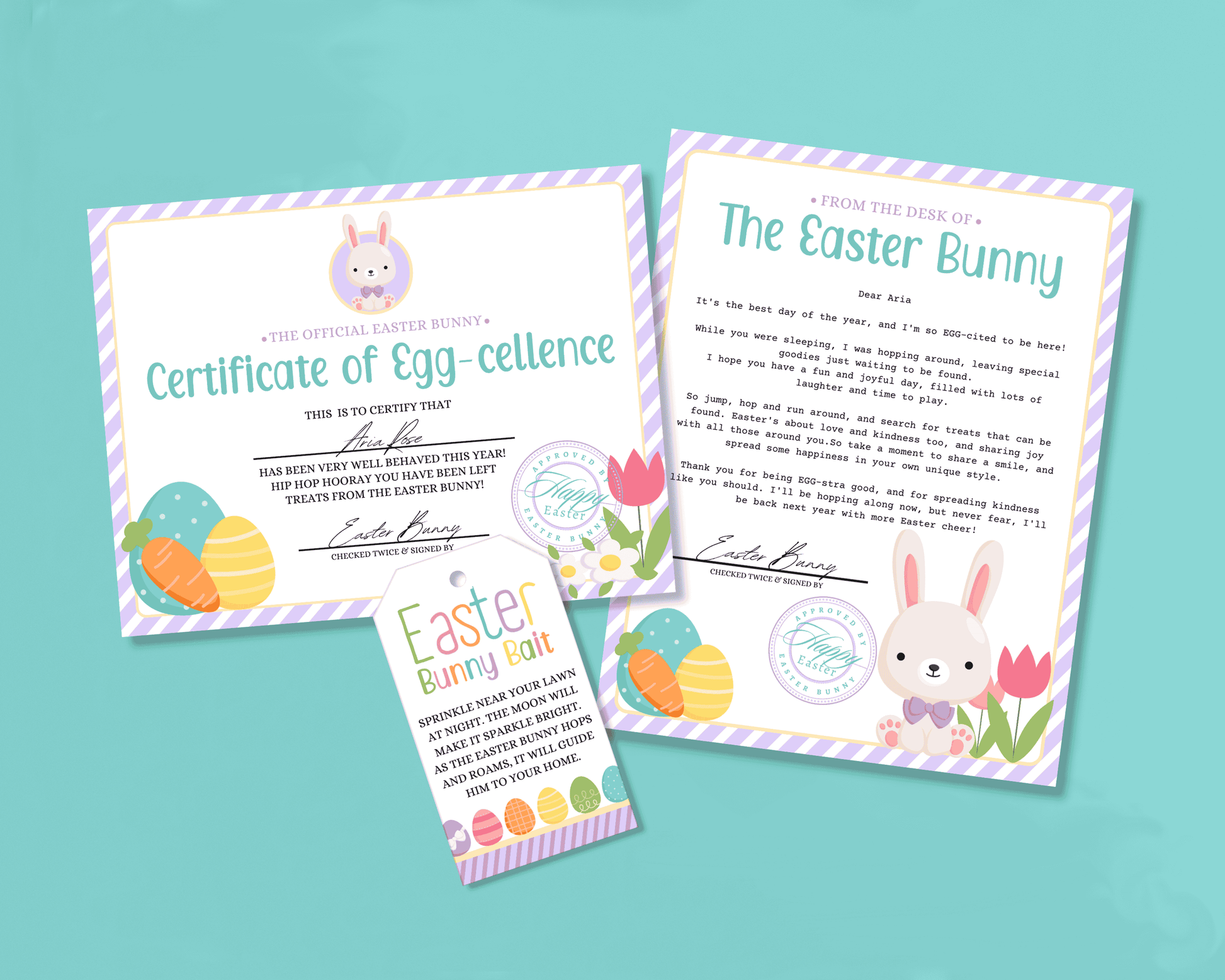 It includes a Purple Easter Bunny Bait Tag, an Easter Bunny Letter personalized for your child, and an Easter Bunny Certificate. These items feature cute Easter designs and are sure to make your Easter celebrations even more special.
