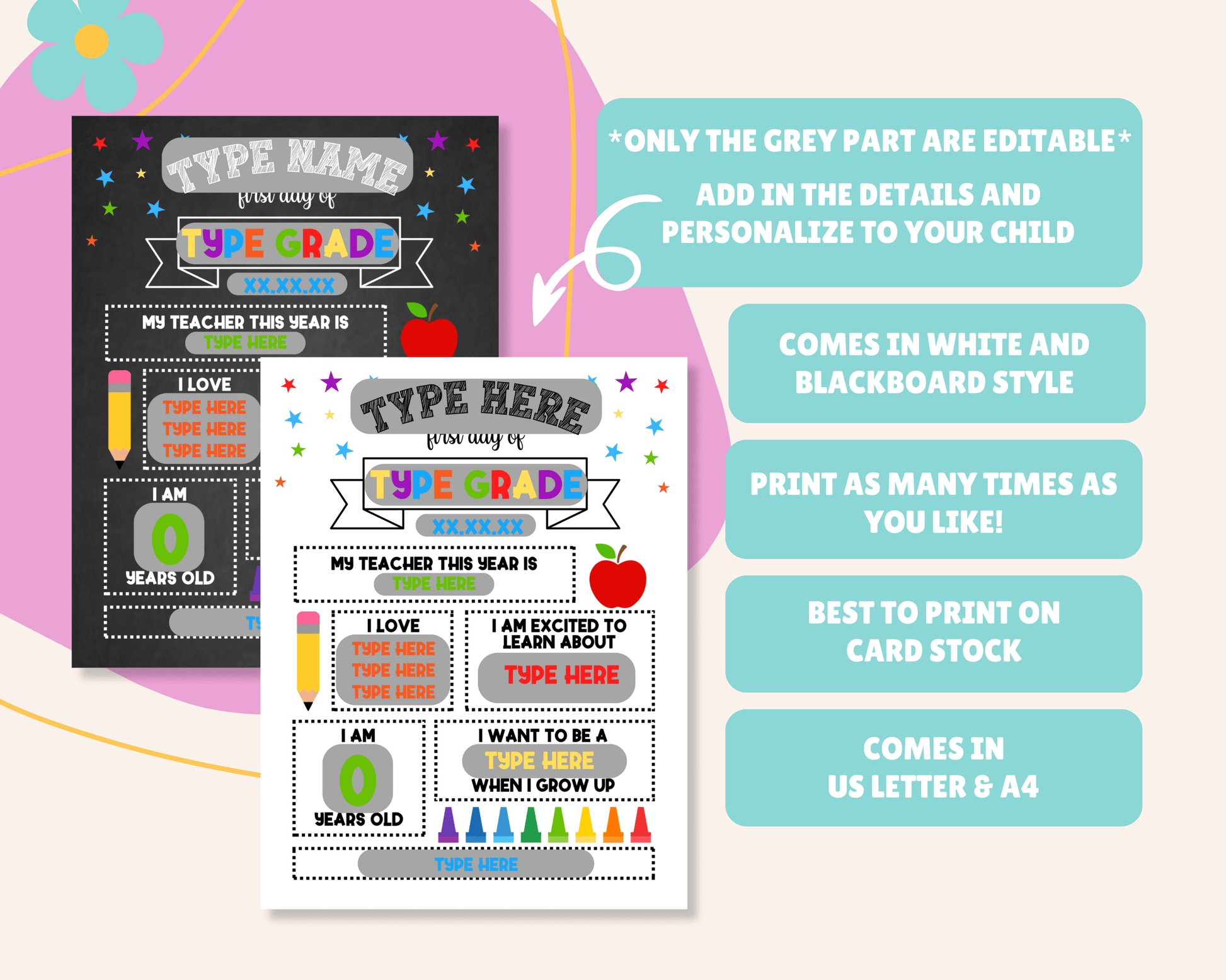 Make the first day of school memorable with these Editable Back to School Signs! Ideal for personalizing with your child's details such as age and what they love, these signs can also include your child's name, school, and grade. Available in both white and black chalkboard styles, these customizable prints are perfect for creating a unique touch on your child's special day. Whether it's for a First Day Of School keepsake or as a thoughtful gift for teachers and classmates, these versatile signs will leave a lasting impression.