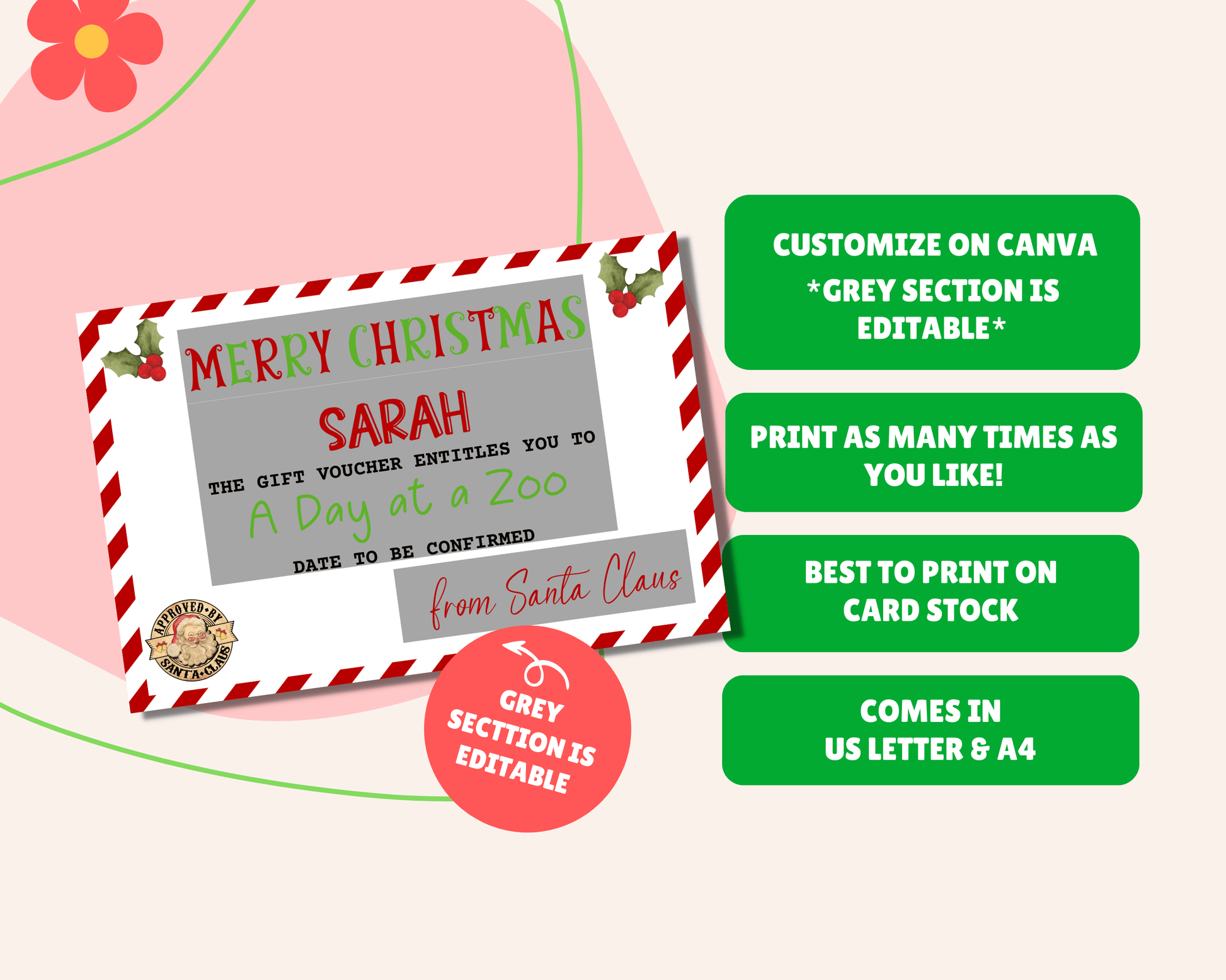 Spread joy this holiday season with our festive Christmas Gift Voucher Template! Perfect for last-minute gifting, this Santa-themed gift certificate is a thoughtful and customizable present. You can easily edit it on Canva, adding your personal touch to create a truly unique gift. Surprise your loved ones with the joy of choice, as they redeem this editable voucher for a special Christmas treat. Give the gift of flexibility and festive cheer with our unique Christmas Gift Coupon. Make this holiday unforgettable with a personalized touch!