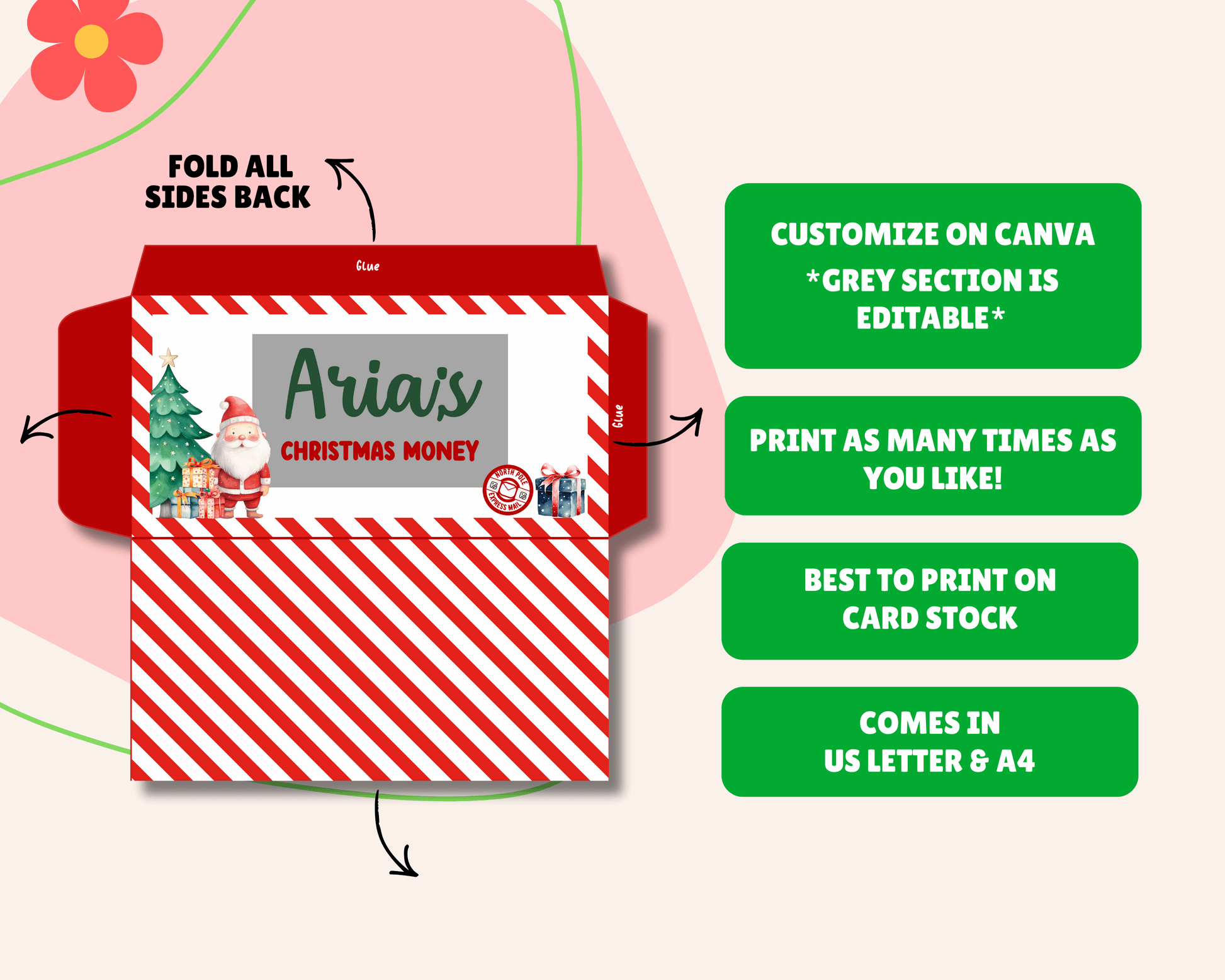 Editable Christmas Money Envelope Template – perfect for Christmas Money Gifts! Use this festive Money Holder or Santa Envelope to personalize your gift. Great for Money Gift Ideas, Christmas Envelopes, or as a thoughtful Money Gift Envelope. Customize on Canva or print and write the name for a unique touch!