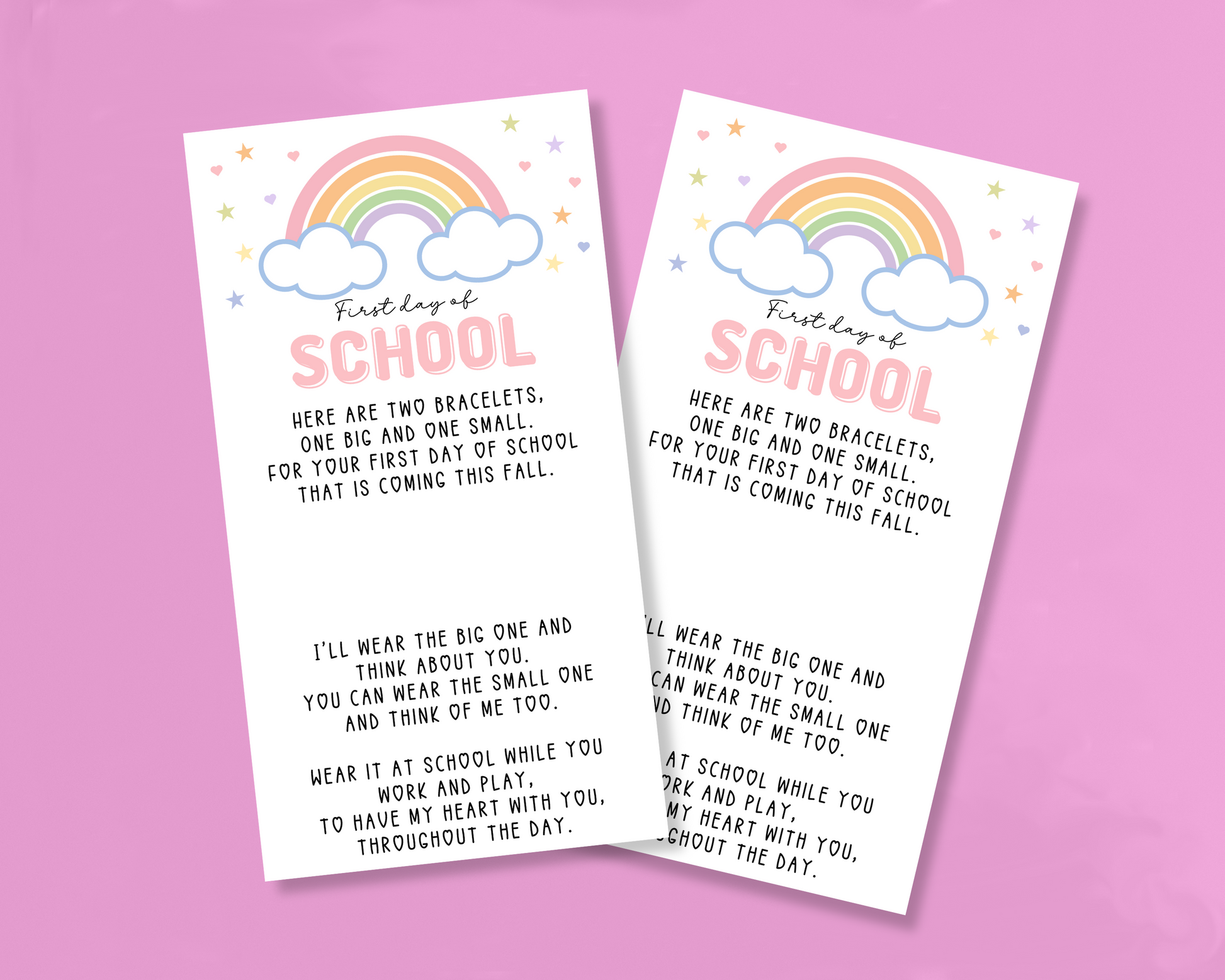 Celebrate the first day of school with a touch of love and connection using our EDITABLE Mommy and Me Bracelet Tag. This delightful First Day Of School Bracelet Gift Tag is perfect for adding a personalized message to your special Back To School Gift Tag. It's an ideal way to commemorate this important milestone with Matching Bracelets Gift. Add your own 2 specially made bracelets to make this gift truly unique.