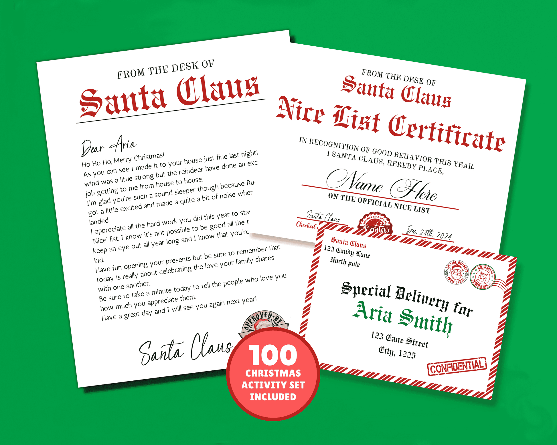 Elevate your holiday season with our EDITABLE Letter from Santa and Printable Santa Stationary set! Complete with Official Santa Letterhead Stationary and a delightful Nice List Certificate and Santa Envelope, this set of two brings the enchantment of the North Pole right to your home. Plus, it's editable on Canva, making it easy for you to customize every detail. Download now and create a personalized touch to make this Christmas unforgettable!