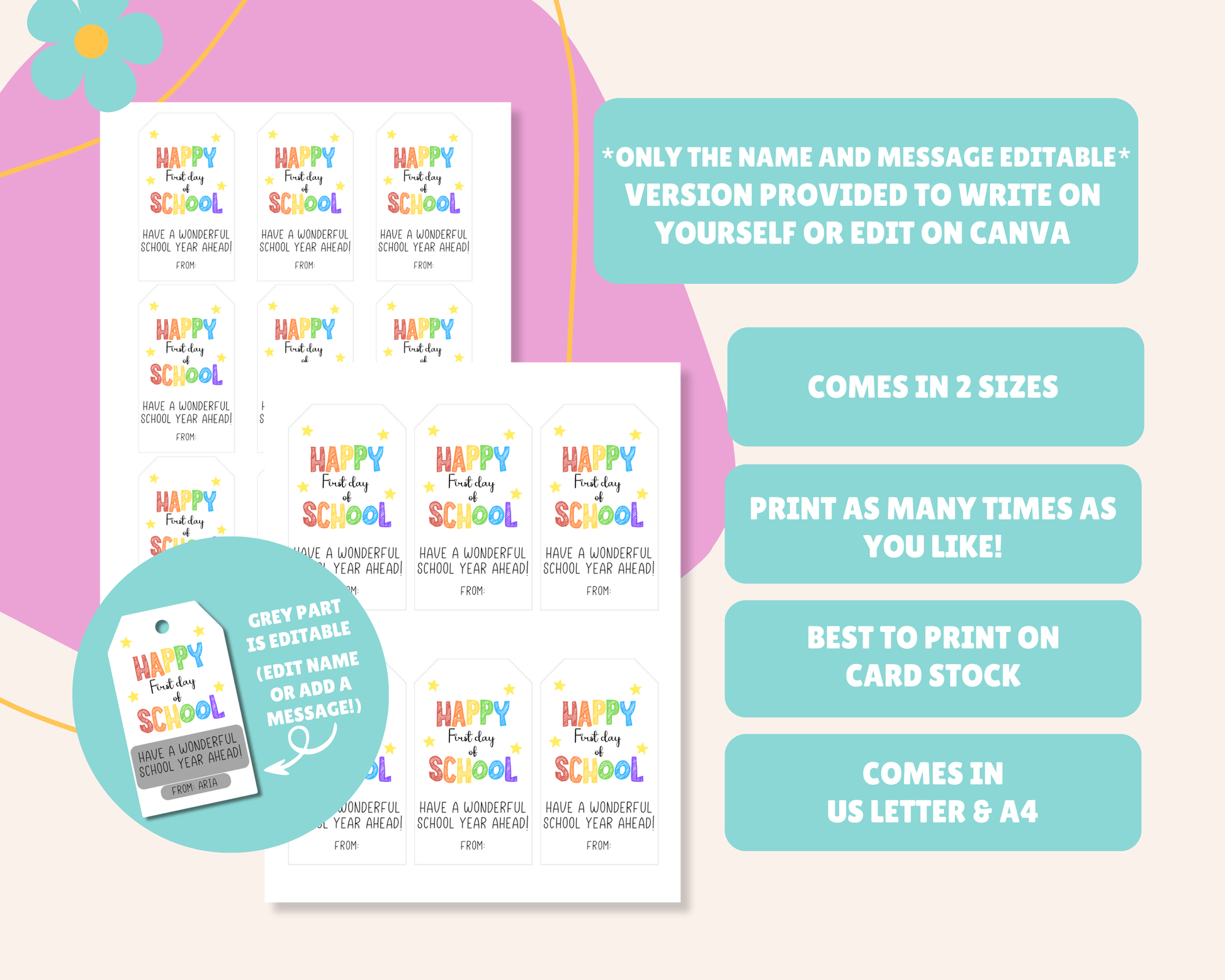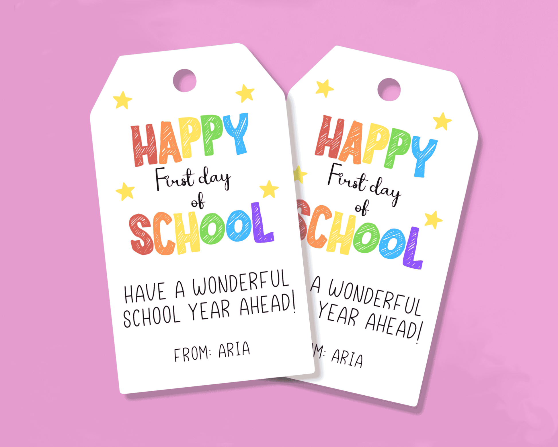 Celebrate the first day of school with our personalized gift tags. Our First Day Of School Gift Tags and Back To School Gift Tags add a special touch to your presents to your friends and teachers. Customize them using Canva with editable small message and name. Make it memorable with our First Day Of School Printable Gift Tags. Order now and make your gifts truly special.