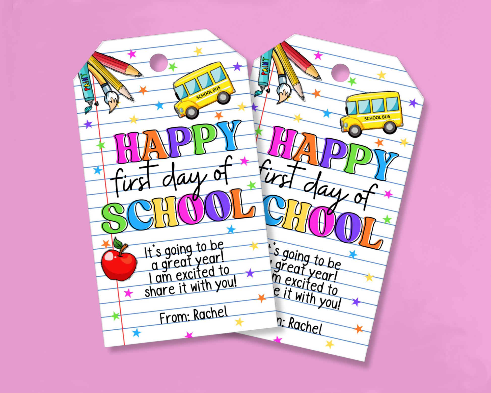 Celebrate the first day of school with our personalized gift tags. Our First Day Of School Gift Tags and Back To School Gift Tags add a special touch to your presents to your friends and teachers. Customize them using Canva with editable names. Make it memorable with our First Day Of School Printable Gift Tags. Order now and make your gifts truly special.