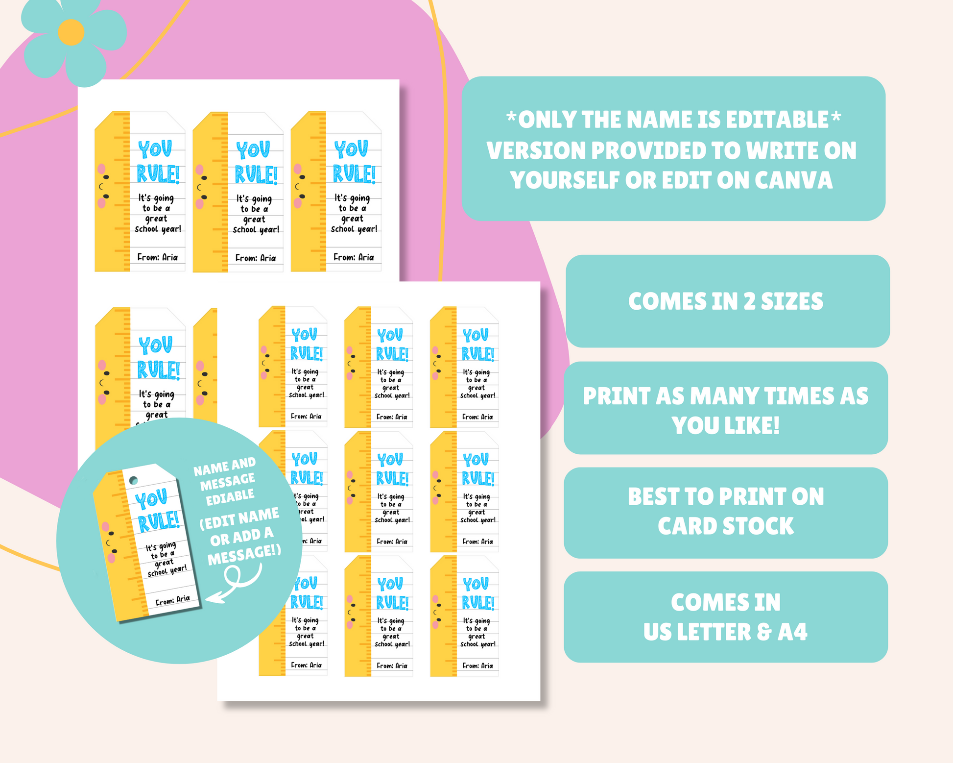 Celebrate the first day back at school with our personalized gift tags. Our First Day Of School Gift Tags and Back To School Gift Tags add a special touch to your presents to your friends and teachers. Customize them using Canva with editable name. Make it memorable with our First Day Of School Printable Gift Tags. Order now and make your gifts truly special.