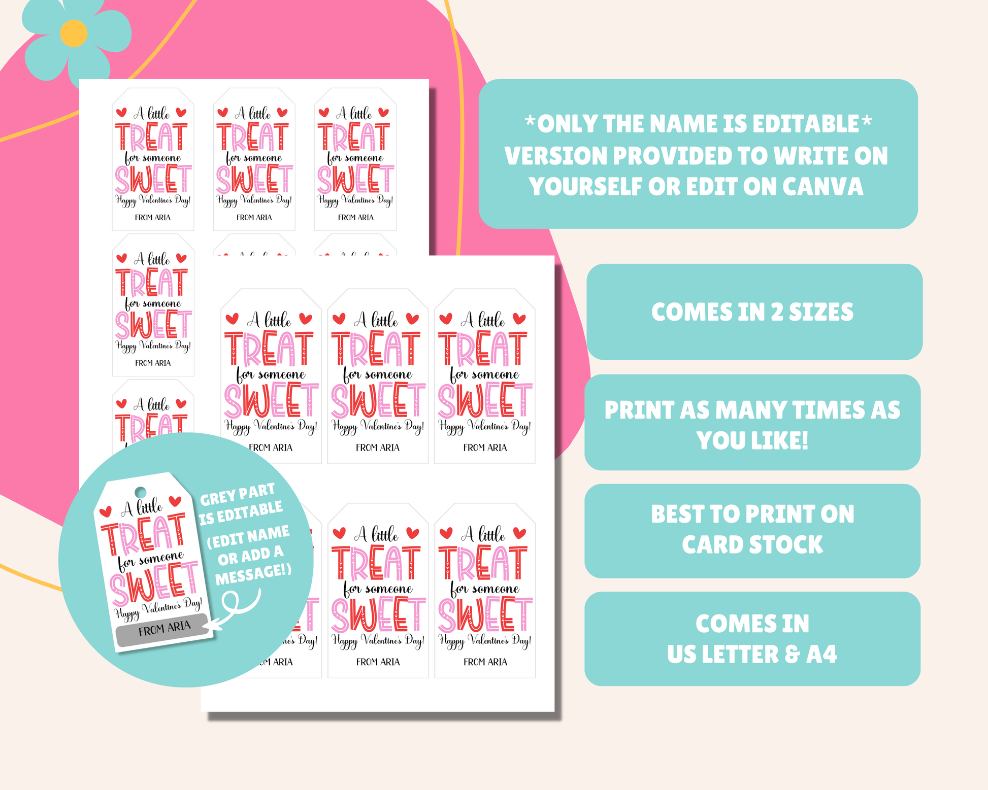The tags come in a printable format, making it easy to print at home or at a local print shop. The best part? The name on the tags are completely EDITABLE on Canva using a free account!