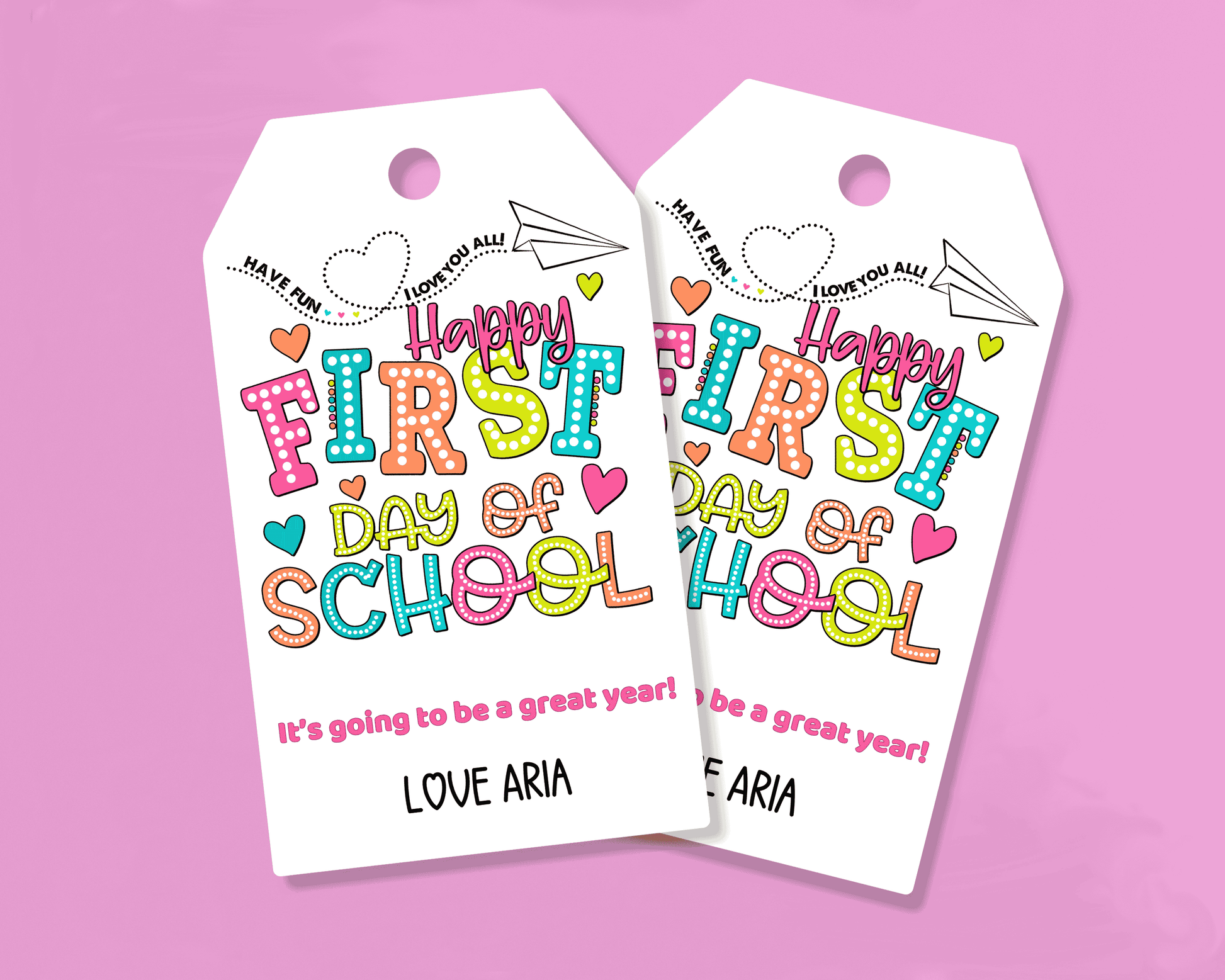 Celebrate the first day of school with our personalized gift tags. Our First Day Of School Gift Tags and Back To School Gift Tags add a special touch to your presents to your friends and teachers. Customize them using Canva with editable names. Make it memorable with our First Day Of School Printable Gift Tags. Order now and make your gifts truly special.